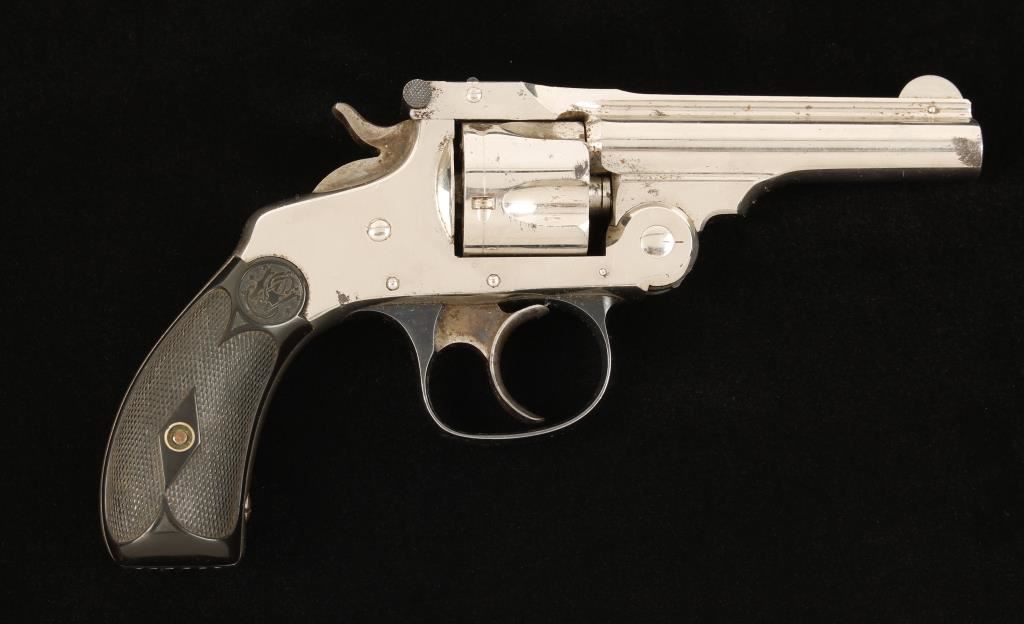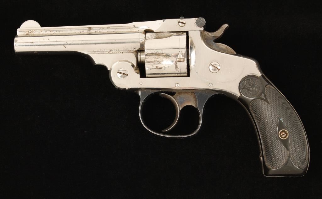 nickel plated double-action top-break 5-shot revolver with a 3" barrel. Plating is approx. 80% with areas of rust breaking through. Bore is bright and shiny with some discoloration near the muzzle. The chambers are fine. The function is good with tight lock-up. The hard rubber grips are 100% complete in very good condition. Condition is good. *Modern Firearm*