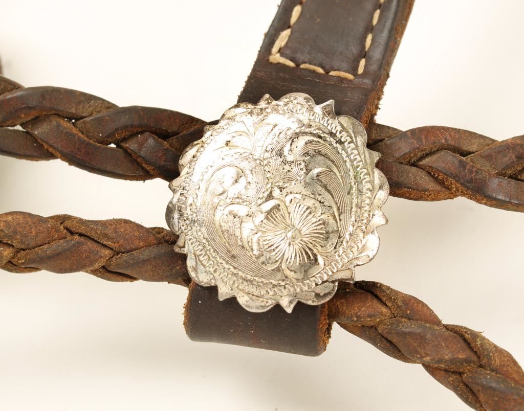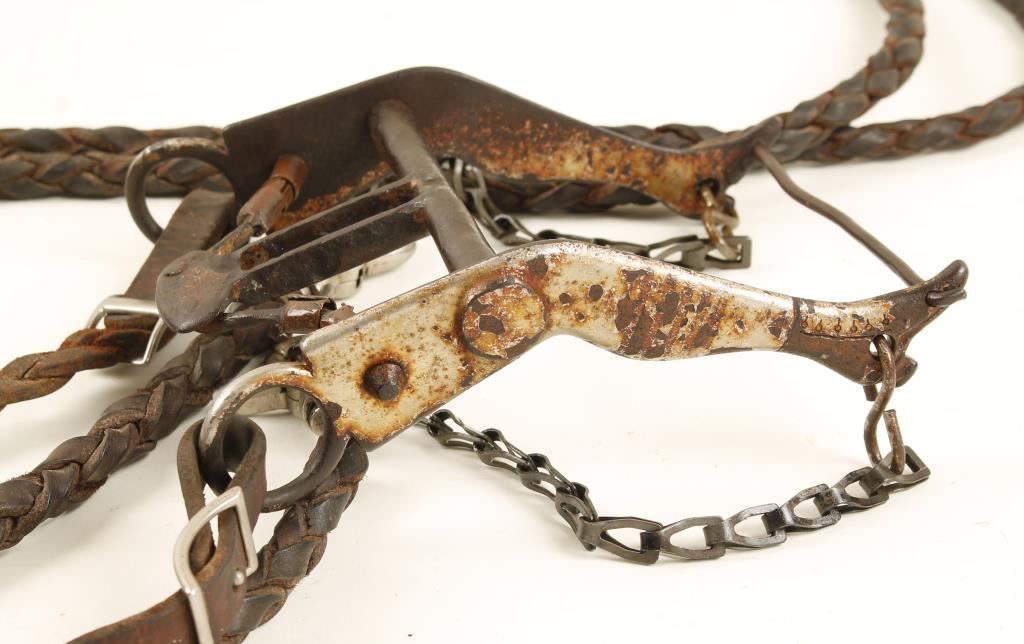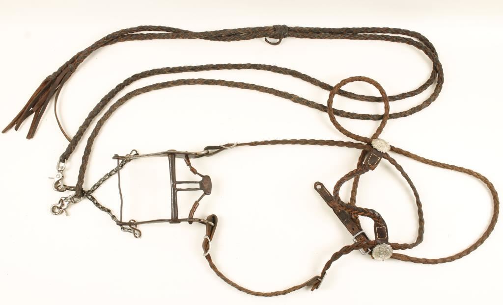 Unmarked with brown rawhide reins and headstall. In rustic condition.