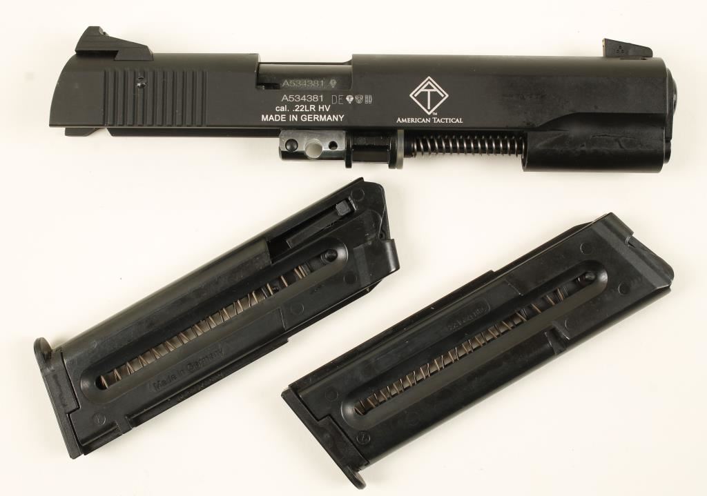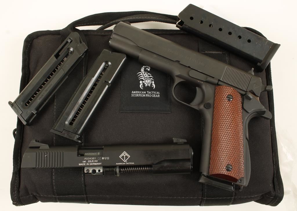 SN:ML7604. Semi-automatic pistol manufactured in the Philippines by S.A.M. Inc. Standard 1911A1 frame with checkered rosewood grips. With GSG .22 conversion slide SN: A534381, (2) .22 mags, (2) .45 mags & soft black carrying case. Condition is overall very good with some light scratches. *Modern Firearm*