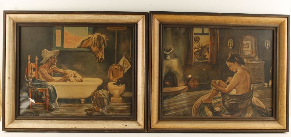 (1) Senorita bathing is being serenaded outside her window by a gentleman with a guitar. (1) Cowboy bathing while his horse peeks through the window. The condition is poor on both as it has water damage.