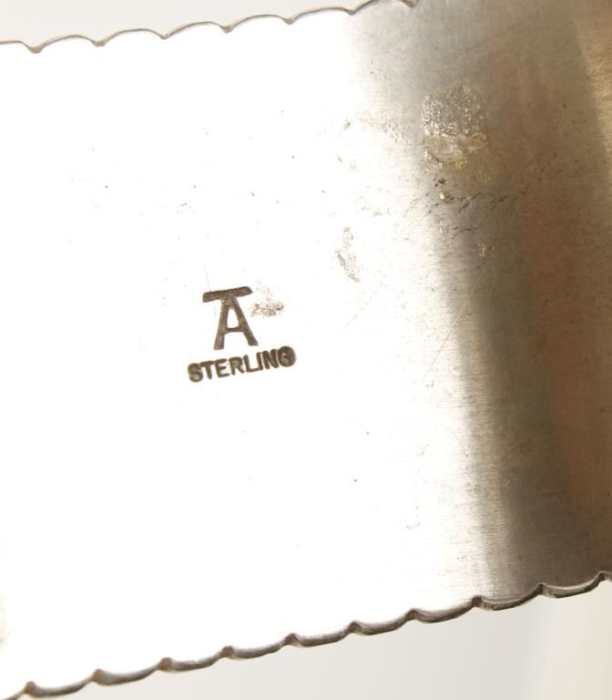 Set in sterling silver. By well known silver smith Tony Aguilar. Marked "TA". In mint condition. Unique geometric cut turquoise design.