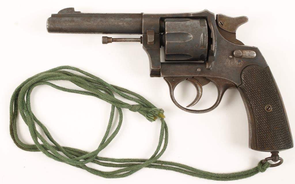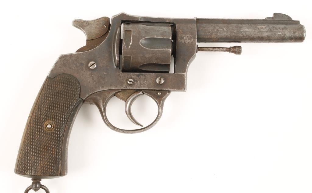 Blued double-action 6-shot revolver with a 4-1/4" barrel. Finish has faded to a grey patina with freckles of surface rust. Shiny bore and clear chambers. Has a safety latch. Functions well with decent lock-up. Checkered wood grips are complete with wear. Includes a braided green cord that may be a lanyard. Condition is fair. *Modern Firearm*