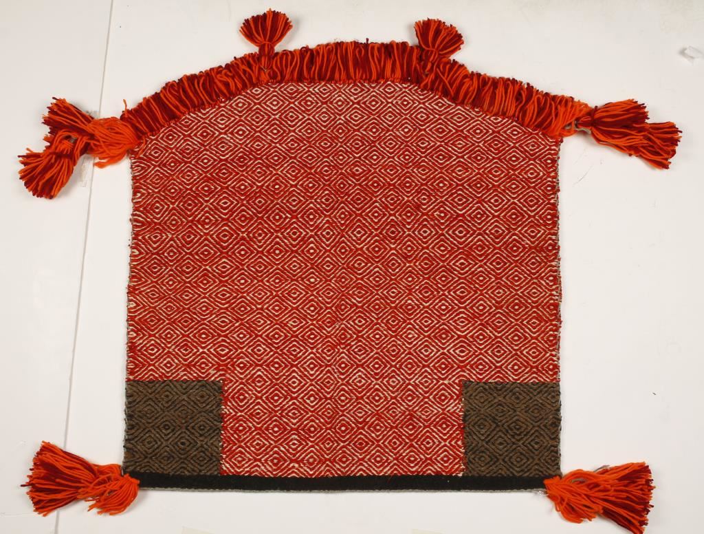 Bright orange red and brown with orange loop fringe. Measures 28"x30".