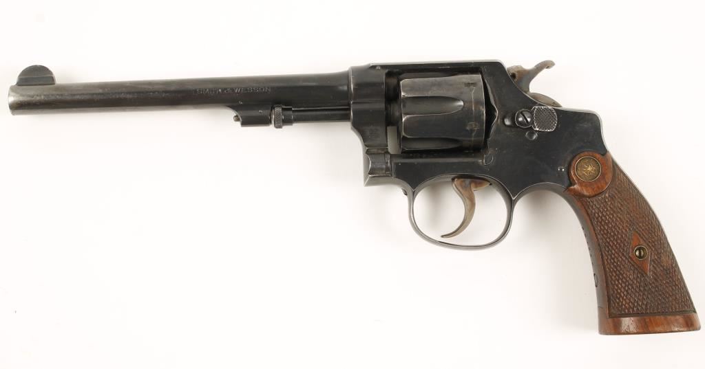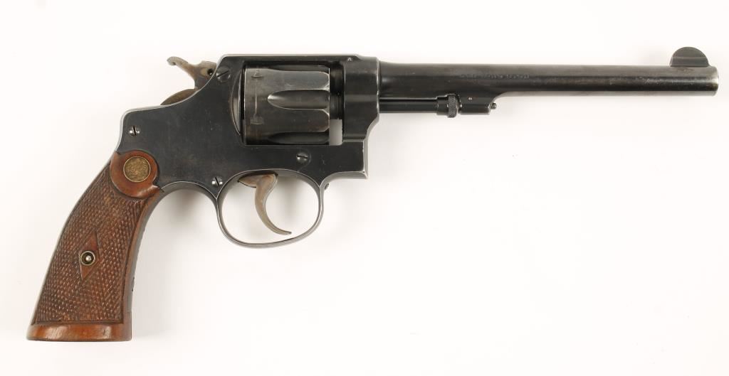 Blued double-action 6-shot revolver with a 6" barrel. Finish shows edge wear and a drag line. Bore is shiny and bright and chambers are clear. Color cased hammer and trigger have strong colors. Checkered wood grips have medallions, a few dings and a patent date on the butt. Function is smooth and tight. Condition is very good. *Modern Firearm*