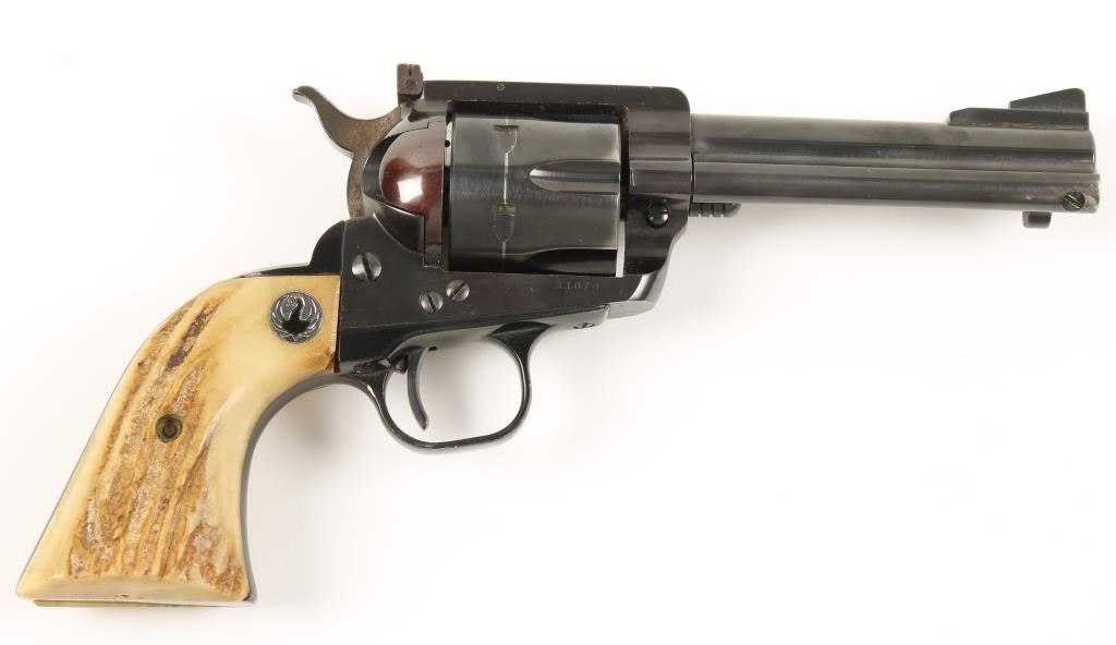 Early blued flat-top single-action 6- shot revolver with a 4-5/8" barrel. Finish has edge wear, a drag line, a scratch, tiny areas of surface rust and the loading gate turning to plum. The grips are stag, with Ruger medallions, in very good condition. The bore and chambers are shiny and there is good rifling. It has a Micro Machine Co. adjustable rear sight and an elevated ramp front sight. The action is the original 3-screw type and it works well and locks up tight. Condition is good. *Modern Firearm*