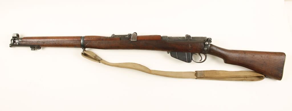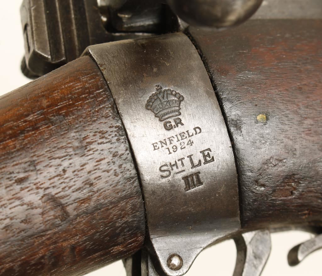 British military blued bolt-action rifle with a 25-1/4" barrel, web sling, and one magazine. Made at Enfield Royal Small Arms Factory in 1924. Import marked. Metal is worn and faded with some pitting. Brass butt plate has a trapdoor with a pull-through (and maybe more) under it. Wood is missing a disc in the butt. There has been a repair under the ejection port and one below the rear sight. There is also the general wear and tear marks of a military rifle. The bore is dark with rifling. The action works well but there is no spring tension on the safety and it can drop the striker to a half-cock position when disengaged. This has a magazine cut-off. Condition is poor. *Modern Firearm*