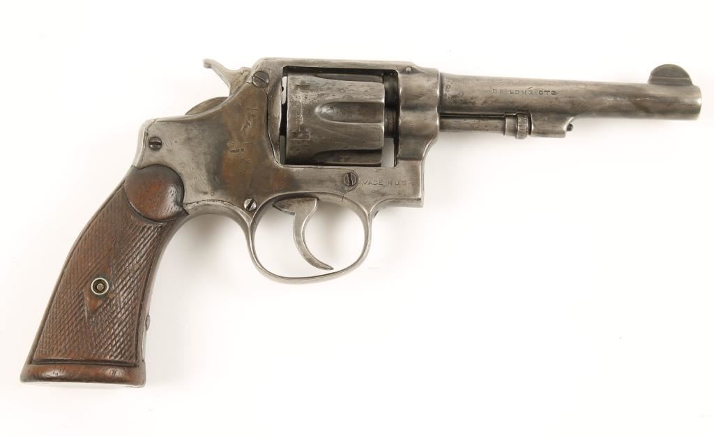 Blued double-action 6-shot revolver with a 4-1/4" barrel. Worn bluing remains in protected areas with silver/grey patina over most. Many dings on cylinder and some on frame. Bore is bright and shiny and chambers are clear. Functions well in double-action but sometimes misses the sear on single action. Checkered wood grips are worn but complete. Condition is fair. *Modern Firearm*