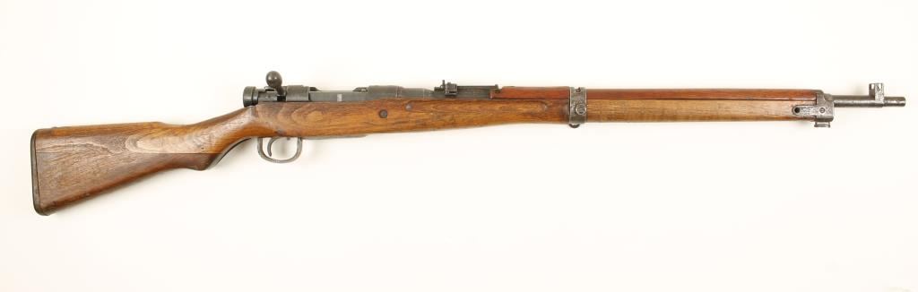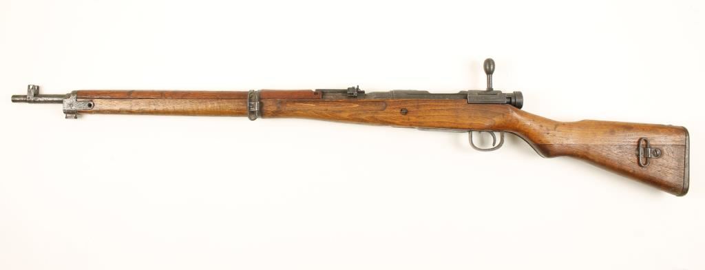 Japanese military blued bolt-action rifle with a 26" barrel. "Mum" is intact. Bluing is mottled with surface rust and rust stains. There is pitting on the trigger guard and floorplate. Wood joint in the buttstock is splitting and there are many dings and rubs. Rear sight has lost its aircraft sight arms. There is no cleaning rod and 2 screws in the bayonet lug nose cap are missing.. Bore is shiny with good rifling. Action works well. Condition is fair. *Modern Firearm*