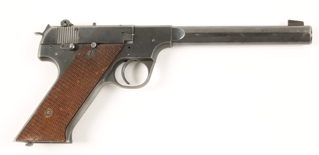 Blued single-action semi-automatic target pistol with a 6-3/4" bull barrel and one 10-round magazine. Finish has edge wear and scratches and is worn to grey on grip straps. Adjustable rear sight and Patridge front sight. Bore is bright and shiny. Functions properly. Checkered wood grips are missing some of the diamonds on each side and show areas of wear. Condition is very good. *Modern Firearm*