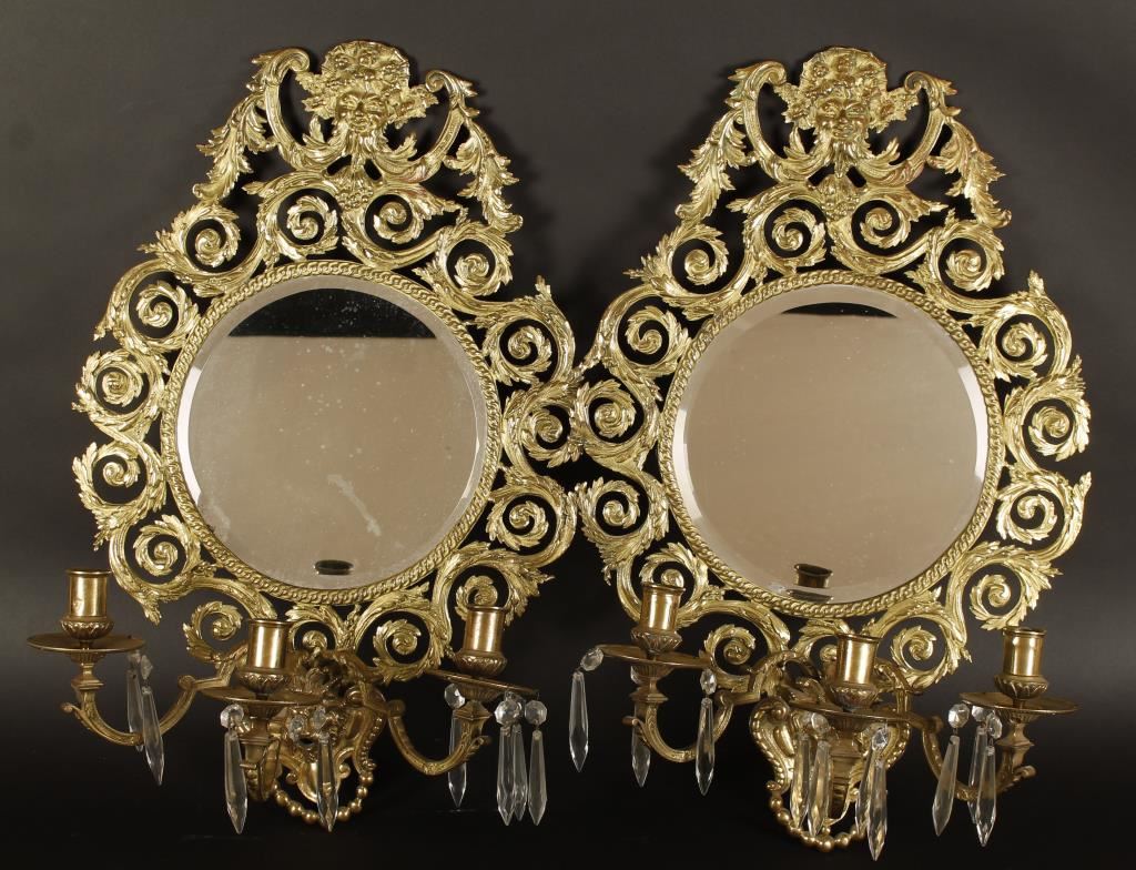 Double mirror back, very elegant and scrolled. Candle bases have hanging crystals. Top of mirror features seasonal character and bottom of mirror has a lion's face.