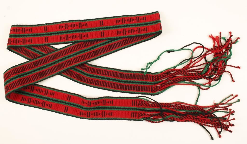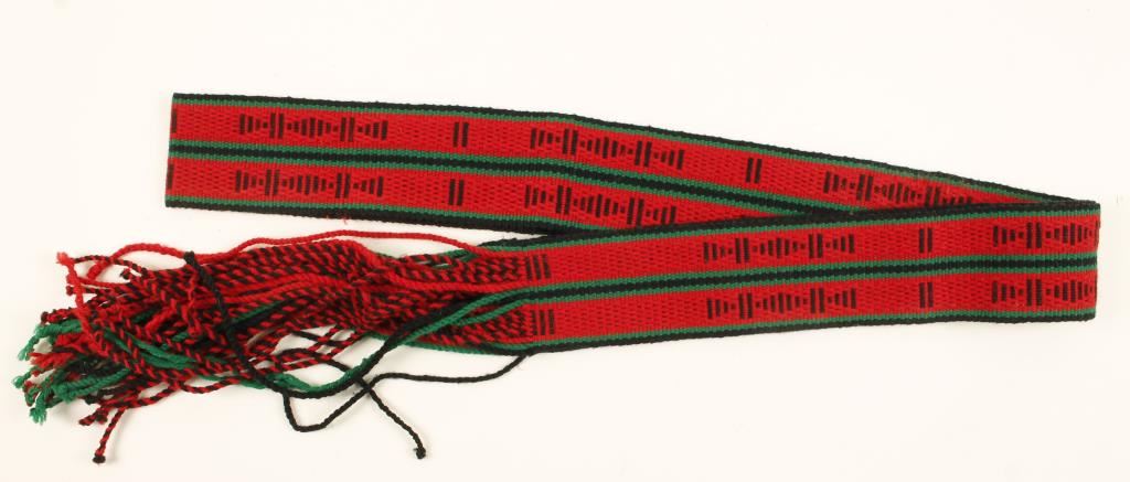 Beautiful Crimson Red, Green & Black woven from wool in a distinctive geometric pattern of colorful tribal symbols. Measures 112" in length and 3" in width. Exceptional condition for a vintage 1950's piece.