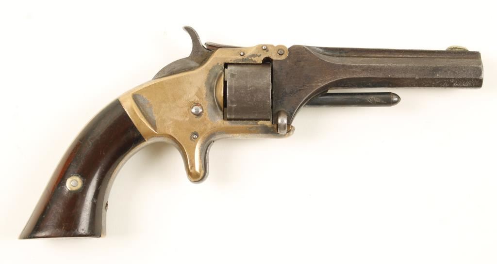 Silvered single-action spur-triggered 7-shot tip-up revolver with a 3-3/16" octagon barrel and top rib. Barrel and cylinder were blued and have faded to brown patina with light pitting. Silver plated brass frame has perhaps 10% remaining silver that has tarnished to a dark grey. Brass has a few dings and small scratches. Bore has rifling and pitting. Chambers are in good shape. Cylinder has 3 roll-stamped patent dates. Action is good but lock-up is loose. Condition is fair to good. *Antique Firearm*