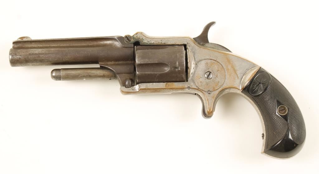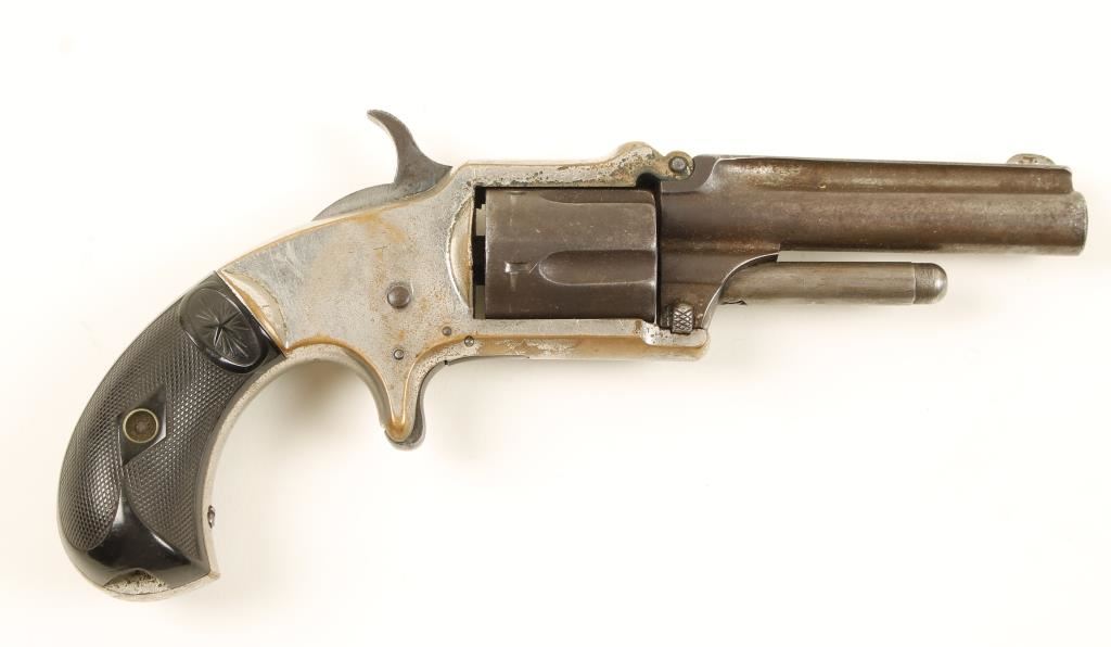 SN: 4615. Nickeled single-action spur-triggered 5-shot tip-up revolver with a 3" barrel and top rib. Approx 50% of plating remains, all on brass frame. Exposed steel has brown patina. Bore has light rifling and moderate pitting. Chambers have pitting. Hard rubber grips are missing a piece and have a few rubs. Action works well with lock-up a little loose. Condition is poor to fair. *Antique Firearm*