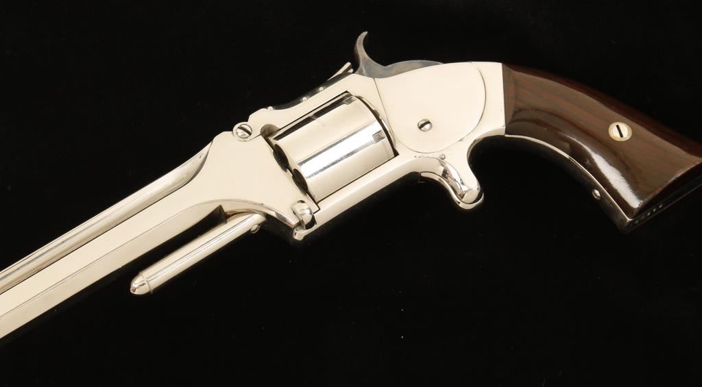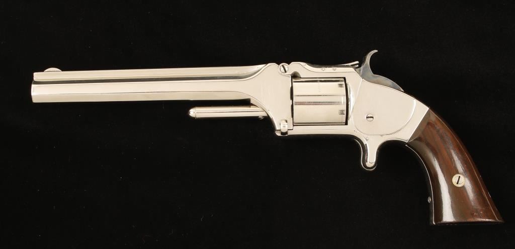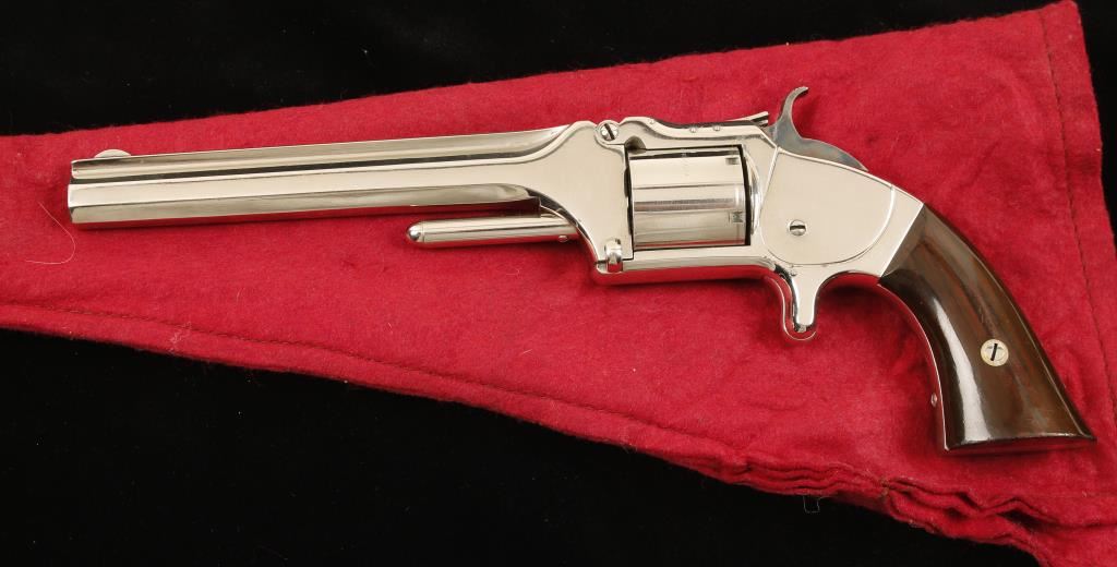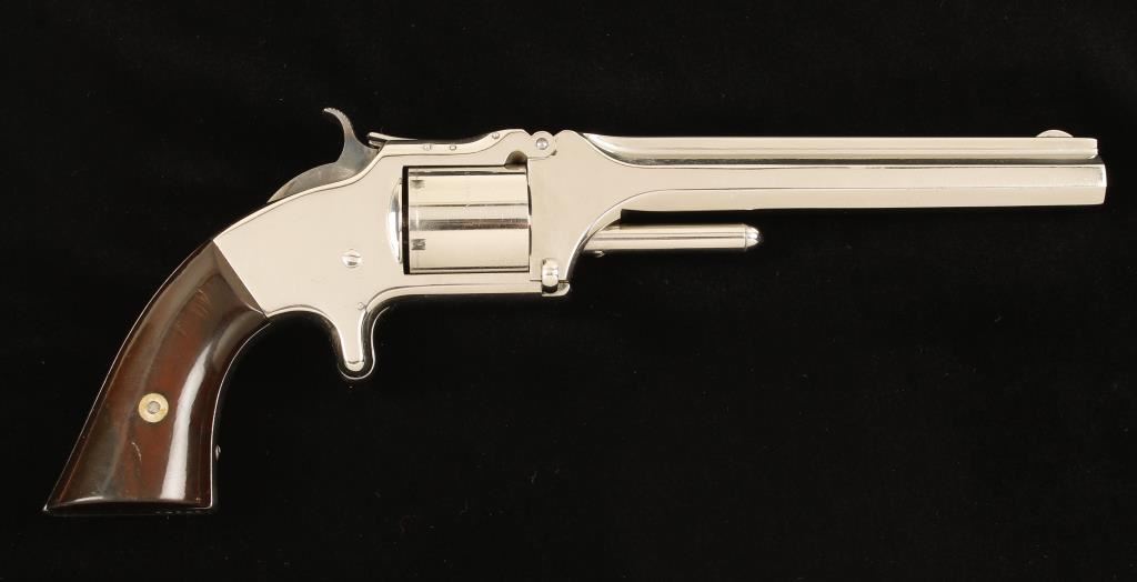 Nickeled single-action spur-triggered 6-shot tip-up revolver with a 6" octagon barrel and top rib. Plating is 95% with a drag line. Bore and chambers are very good. Case colored hammer has lots of color. Rosewood grips have some dings and a few tiny scratches. Action is smooth with good lock-up. Includes double-layered felt sleeve for storage. Condition is very good. *Antique Firearm*