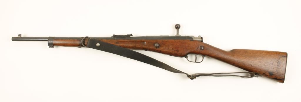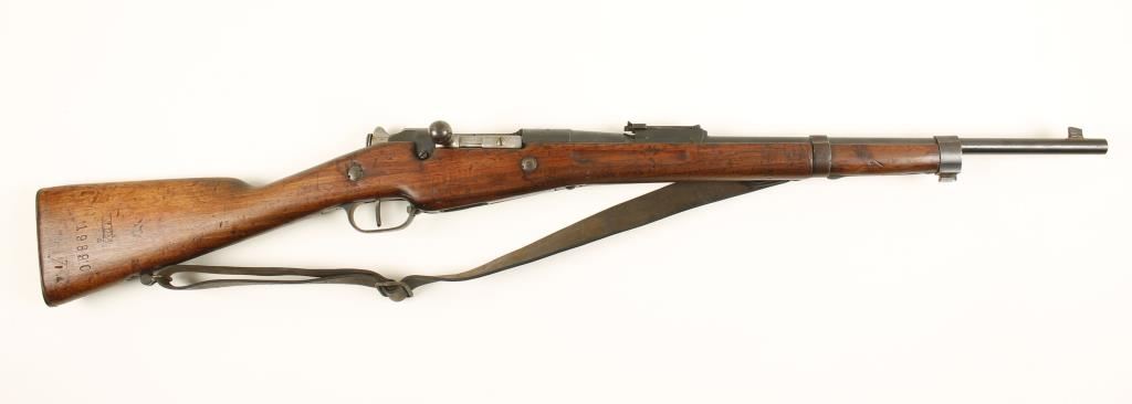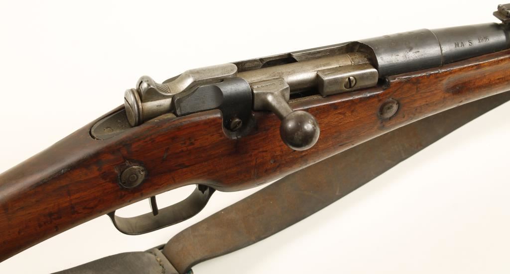 French military blued bolt-action rifle with a 21" barrel, no magazine and a leather sling. Bluing is turning to brown in spots with surface rust, edge wear and small dings. Bottom metal number doesn't match the receiver. Dated 1916. Wood is stamped with the receiver serial number as well as one other and there is "Z.W. 1235" stamped on it also. There is a patch repair on the right side of the rear cross bolt. It bears a multitude of dings but nothing too deep. Bore is frosty with good rifling. Action is working well. Condition is fair. *Modern Firearm*