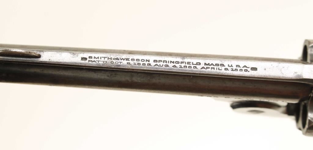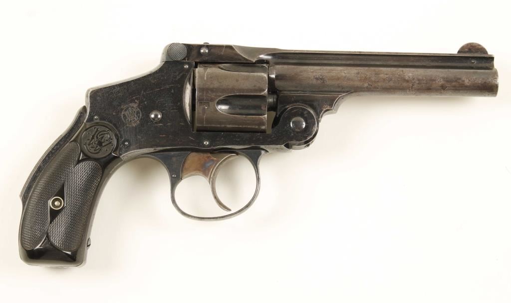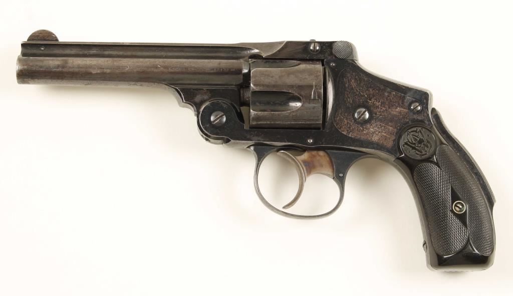 4th model. Blued double-action only 5-shot top-break revolver with a 4" barrel. Finish is faded/worn to a shiny silver/grey patina with some edge wear. The case colored trigger still has nice colors. The bore is shiny with rust spots and good rifling. The chambers are clear of any deficiencies. The checkered hard rubber grips are complete and have only a little wear. Function is very smooth and tight. Condition is good. *Modern Firearm*