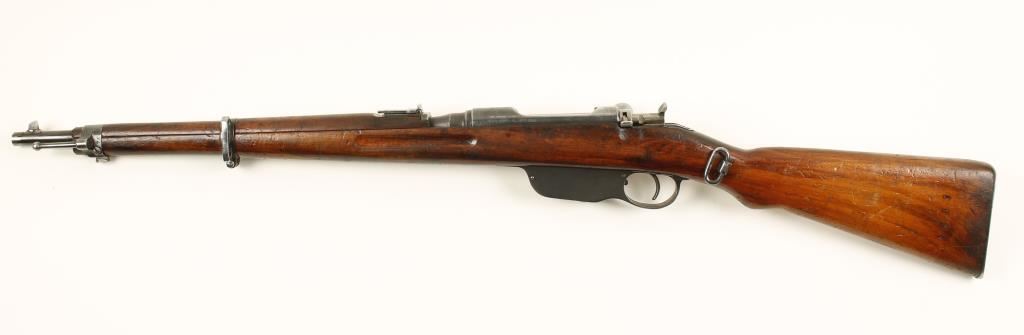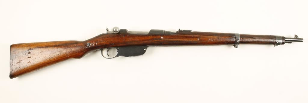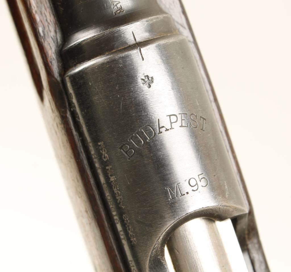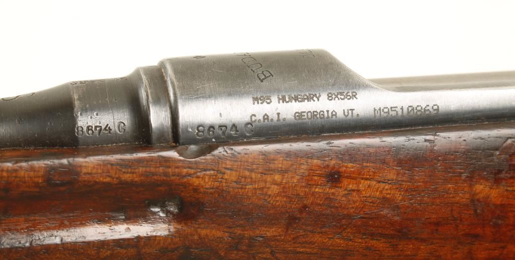 Hungarian military blued straight-pull bolt-action rifle with a 20" barrel. Import marked. Bluing is worn with lots of edge wear. Buttplate is mostly bare metal with surface rust and many dings and scratches. Wood has the serial number stamped on the right side of the stock with another faded number below it and another number struck out one left side. There is an oval wood plug on the bottom of the butt where a sling swivel used to be. Stock is scratched. The muzzle end of the handguard is very worn with a crack running back. Bore is frosty with rifling. Action is working well. Condition is fair. *Modern Firearm*