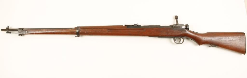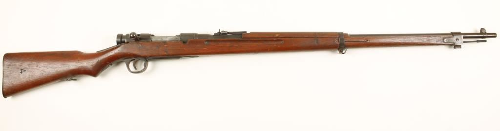 Blued Japanese military bolt-action rifle with a 31-1/2" barrel. Bluing has turned to brown with a few dings and edge wear. Stock is stamped with the number "4" and has a crack running forward from the upper tang as well as dings, scrapes and scratches. Bore is dark with very little rifling. Action works well. Condition is fair to good. *Modern Firearm*