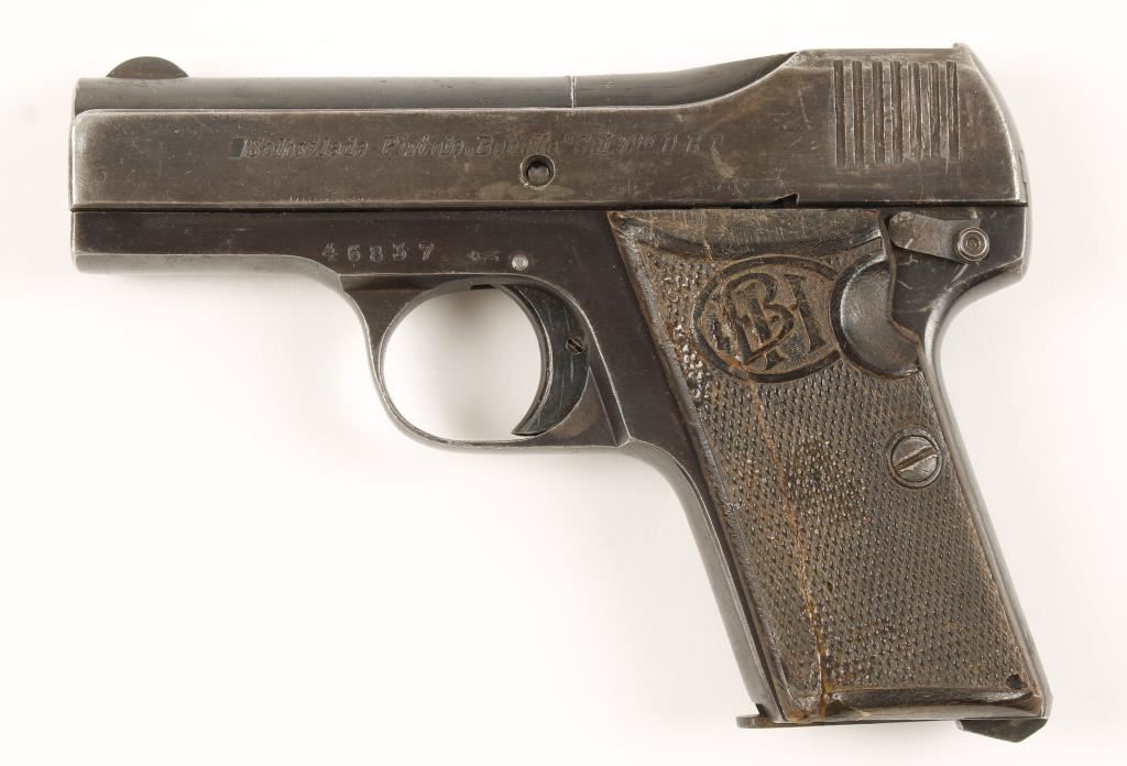 Blued single-action semi-automatic hammerless pistol with a 3" barrel and one magazine. The finish on the slide is dull with edge wear and the frame has edge wear with dull grip straps. Checkered grips have a repaired crack and small holes in them. The bore is not quite bright but it has sharp rifling. Condition is fair to good. *Modern Firearm*