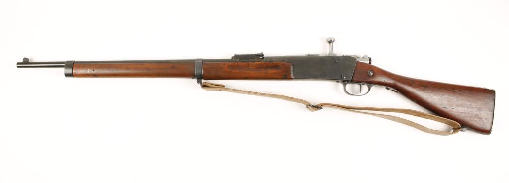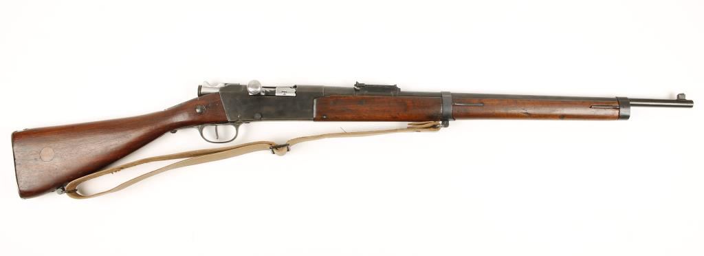 French made bolt action rifle with 27" barrel. Blued finish, 2 piece wood stock, steel butt plate and rear sight graduated to 2400 meters. Barrel has been replaced with a 1917 dated barrel. This is possibly a civilian version with a shorter barrel and no bayonet lug. Very good bore and action. Includes leather sling. Condition: Very good overall. *Antique Firearm*