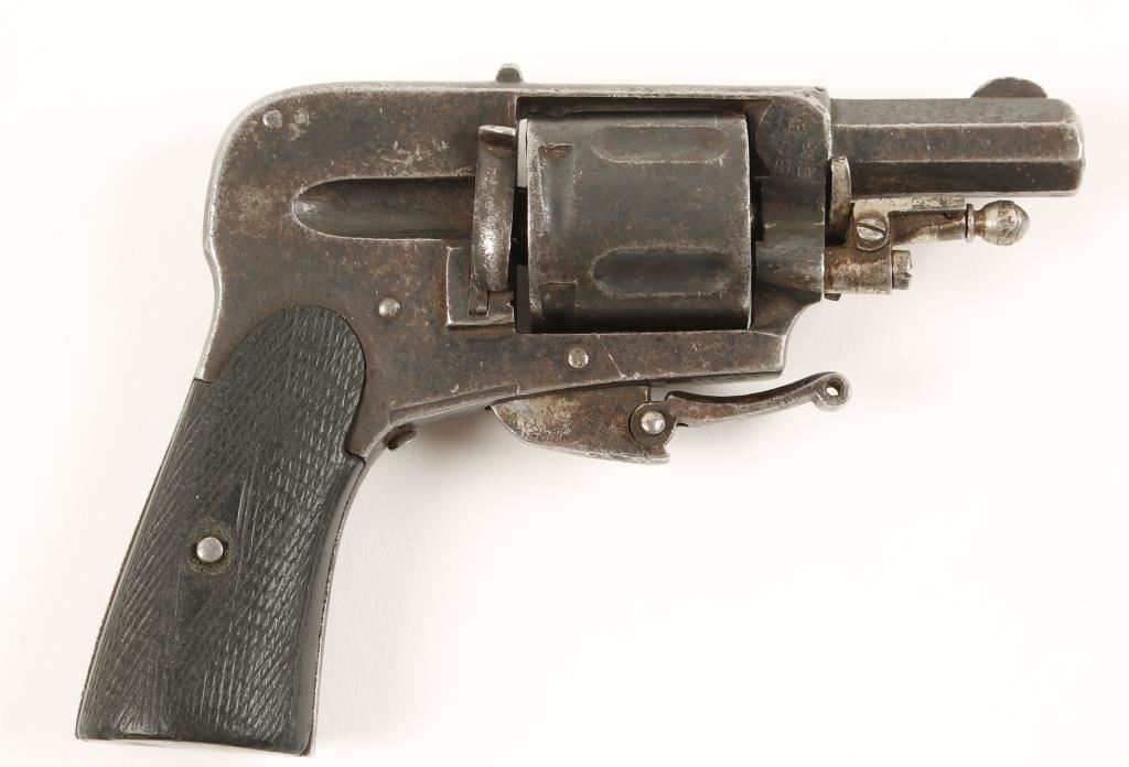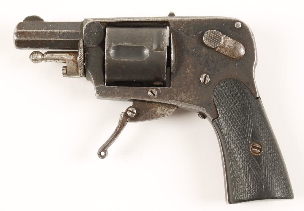 Blued double-action only 5-shot folding-trigger hammerless revolver with a 1-1/2" octagonal barrel. The finish has extensive edge wear with the exposed metal surfaces showing surface rust damage. The bore is not shiny with dark grooves and th chambers are free of any damage. The checkered grips are worn with scratches. There is no firing pin so the gun does not function. Condition is poor to fair. *Modern Firearm*
