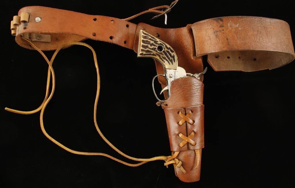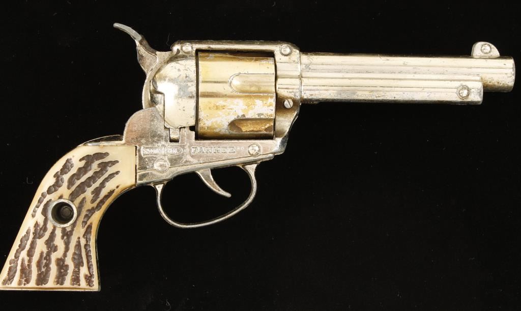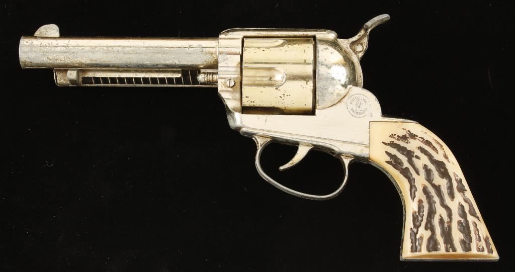 Original holster & belt. The Mattel Toy Company really locked up the western toy gun market with the introduction of its Fanner 50 pistol in 1958. The company aggressively developed the Fanner line, which led to the development of the Shootin' Shell line of western guns. This was one of a few cap guns that shot 'bullets' (the bullets were never really shot out of the gun, but looked like bullets and they loaded like bullets). You would put a stick-on cap (Greenies) on the end of the bullet and then when the trigger was pulled, the cap would fire and the cylinder turned. These actual bullet guns were so popular that many were overused and no longer work. This Fanner is in good working condition It does have some finish loss and a cover over a bolt on the grips.