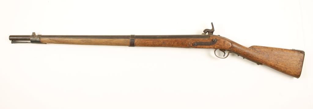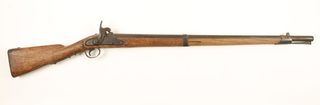 Rifled cap and ball muzzle loader musket with a 30-1/2" barrel. Metal finish is brown with pitting near the muzzle, on the buttplate, and near the nipple. No identifying proofs or marks. The wood has been worn away so far that there is a hole into the ramrod channel. Missing chips with battering and a replacement fore end. Bore is rusted and pitted with rifling. Condition is poor. *Antique Firearm*