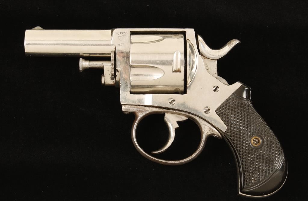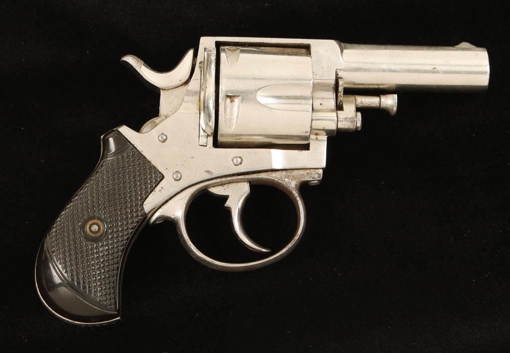 Nickel plated double-action 5-shot revolver with a 2-1/2" barrel. Plating still covers more than 90% of the steel but it has scratches and is fading. The front sight blade is missing and has been replaced with a dollop of epoxy. Chambers and bore show evidence of light pitting but there is good rifling. The hard rubber grips have a few dings. Action works well. Condition is very good. *Antique Firearm*