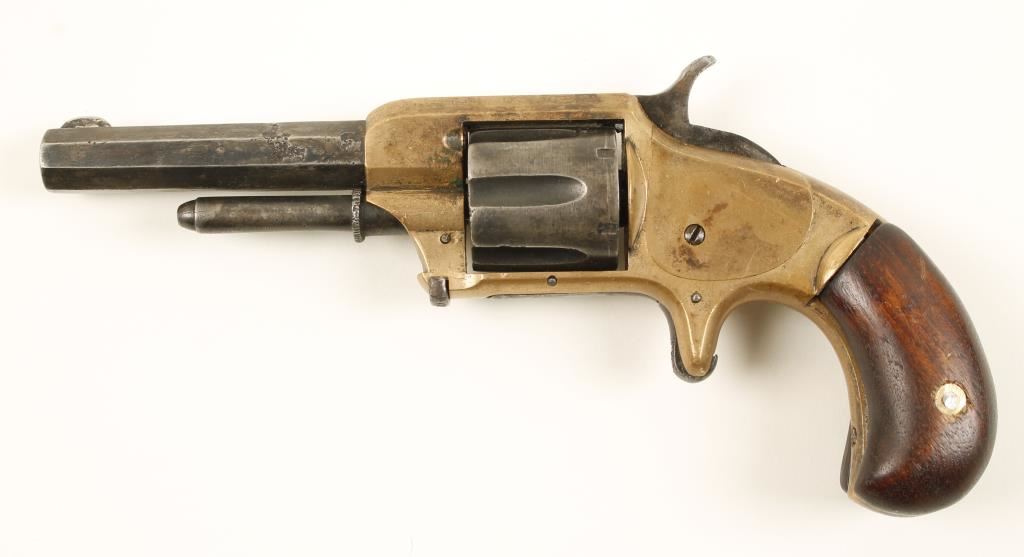 Single-action rimfire spur-triggered 6-shot revolver with a 3-1/2" barrel. Bore has heavy pitting with sharp visible rifling. Blued barrel, hammer, trigger, cylinder, cylinder pin and latch have all faded to patina with some deep pitting. Brass frame has scratches and a few dings. Wood grips are missing the original screw and are rotating around that axis. The grip panels have little damage. Action is fine. Condition is fair to good. *Antique Firearm*