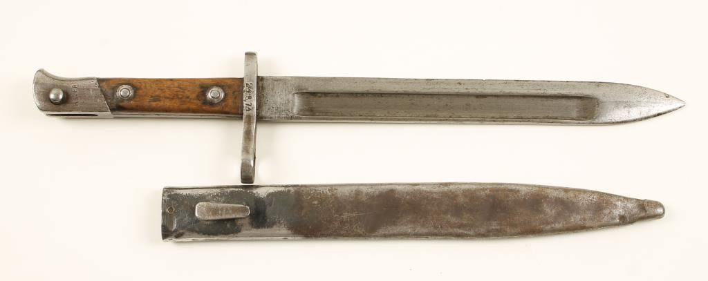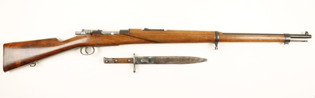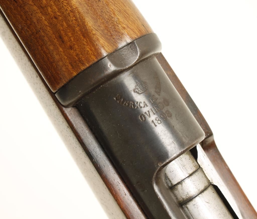 Military blued bolt-action rifle with a 29" barrel. Made in Spain at Oviedo arsenal. Includes a bayonet and scabbard. No matching serial numbers other than the receiver and the bottom metal. Barrel bluing is good with a few dings. Receiver is dated 1898 and has edge wear. Floor plate has surface rust stains. Buttplate has edge wear, dings and surface rust pitting. Fine wood stock has been refinished and has scratches, rubs and dings with relatively sharp edges. Receiver tang is sitting proud of the stock. Bore is dark with strong rifling. Action works well. Condition is good. *Antique Firearm*