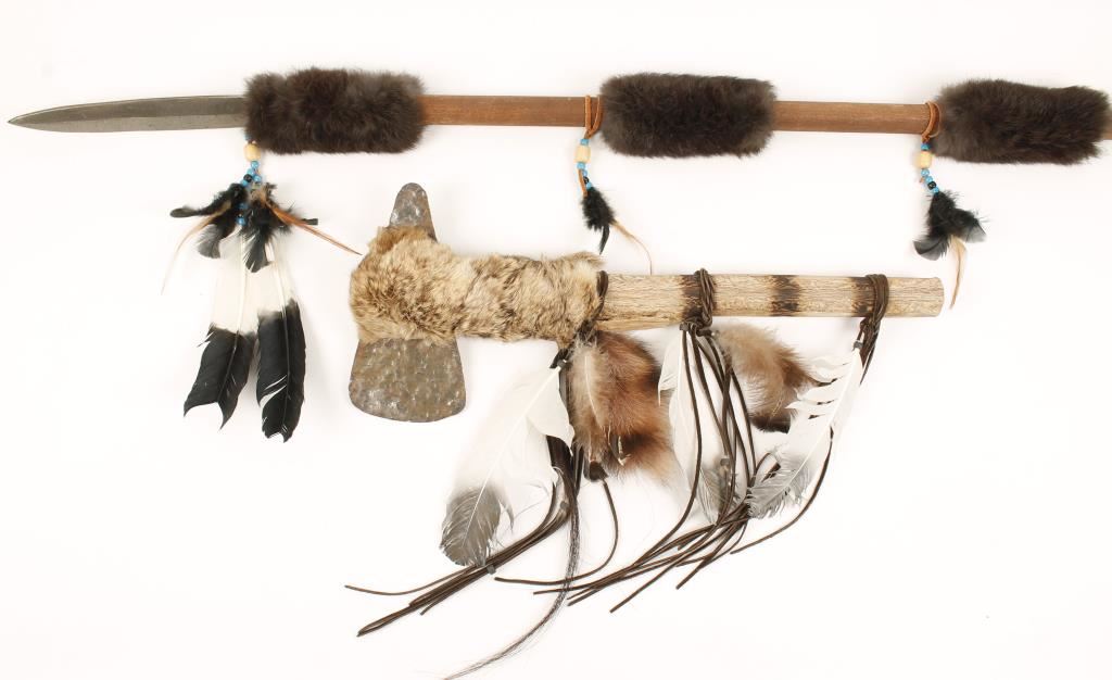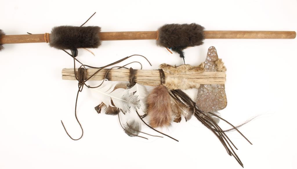 Including a tomahawk with natural wooden branch handle, feathers, rawhide and a triangular hammered blade. Also included is a 70" wooden stave with colored animal pelts.