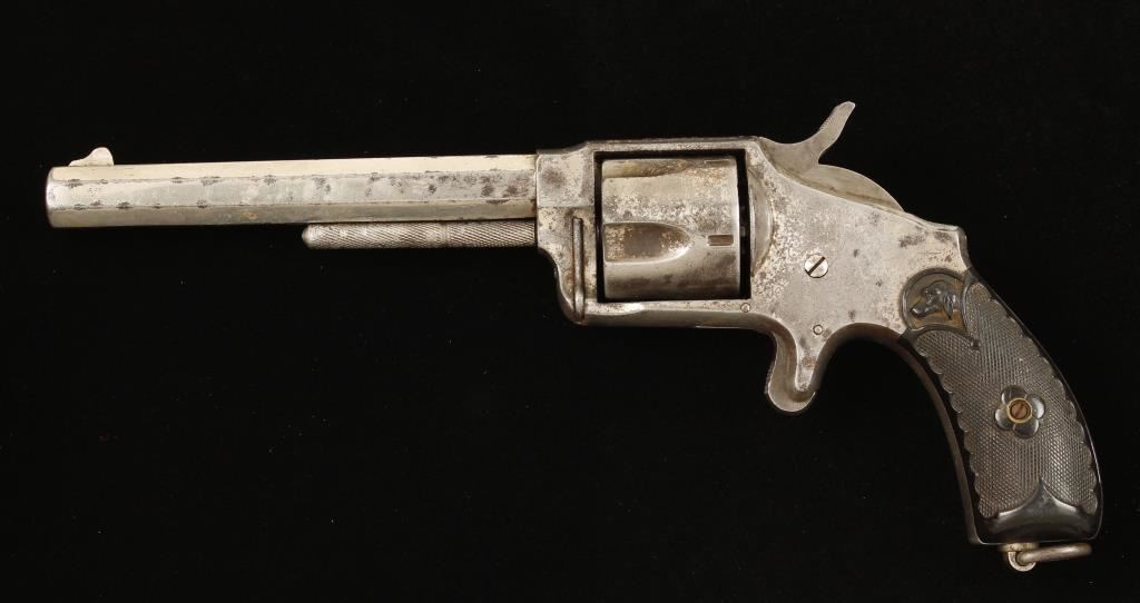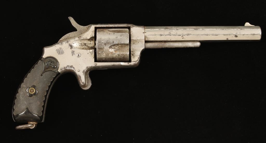 Nickel plated single-action spur-triggered 5-shot revolver with a 5" barrel. The plating is approx. 45% present and what remains has scratches and dings and lost its luster. Surface rust and pin-prick pitting cover much of the exposed steel. Bore is dull with some sharp rifling and the chambers look good. Hard rubber grips with dogs head have no visible cracks or chips and have some dings and wear. Condition is fair to good. *Antique Firearm*
