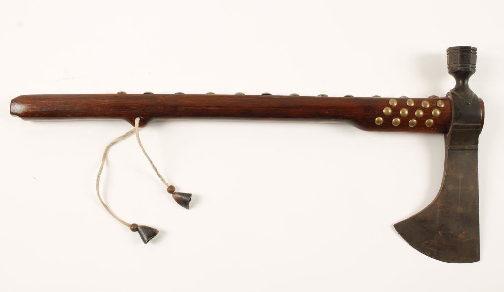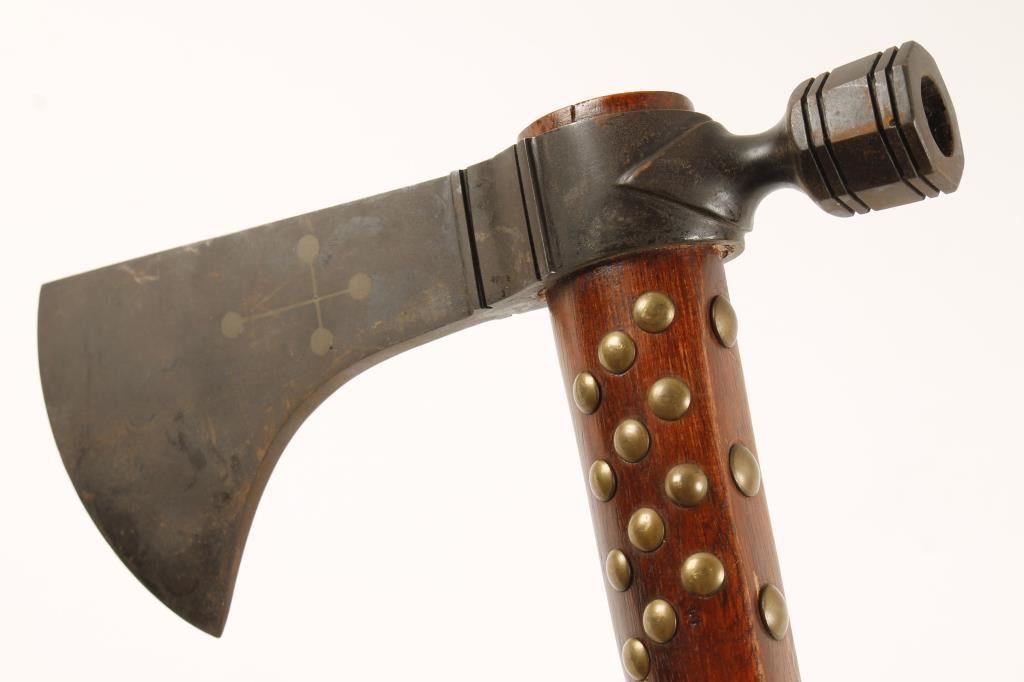 20th Century with more contemporary wooden handle with brass tack decoration. Blade has a cross design on either side. Measures 17 1/2" overall with a 6" blade.