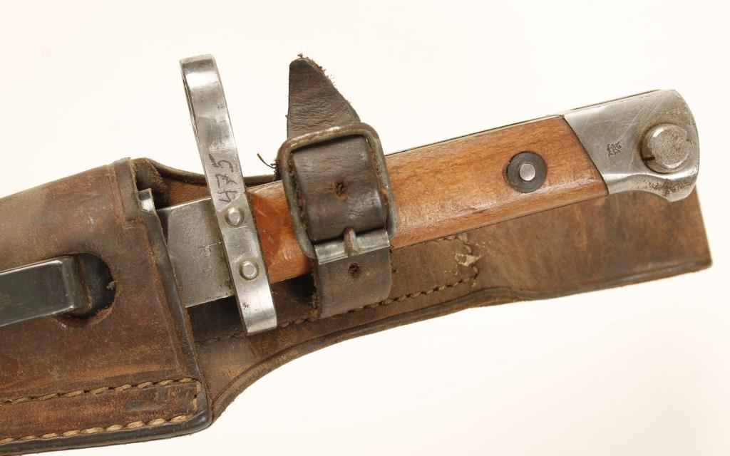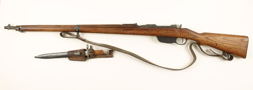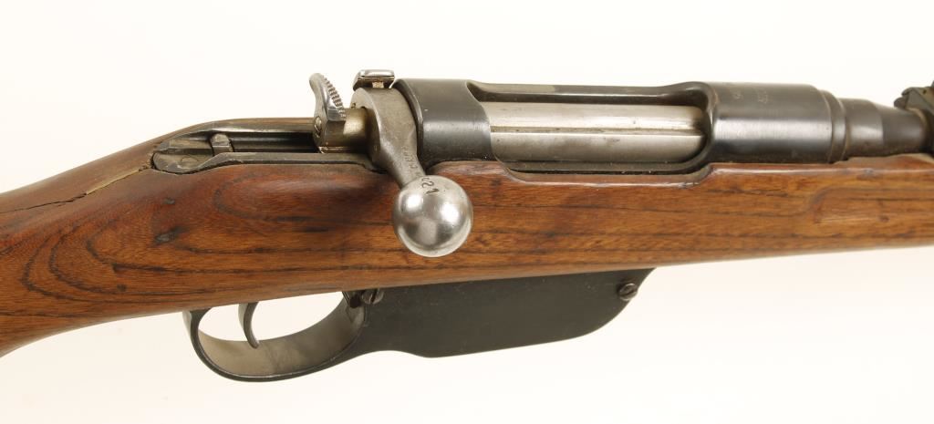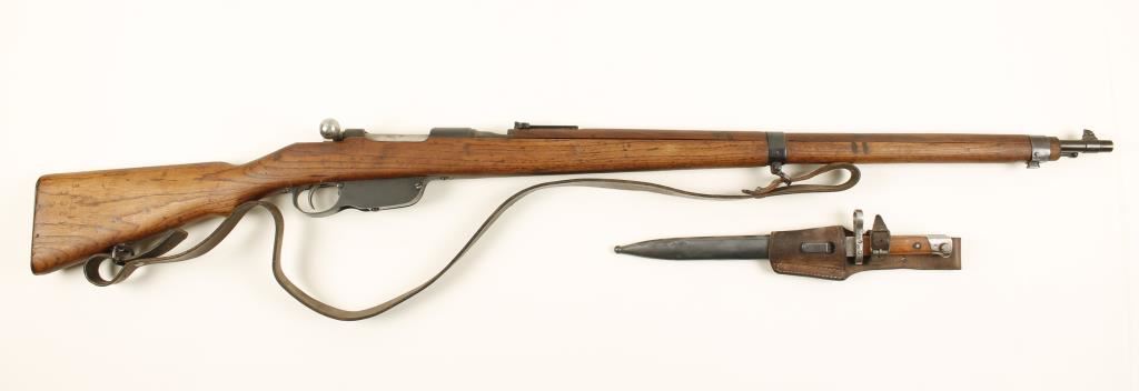 Austrian straight-pull bolt-action military rifle with a 30" barrel. All serial numbers do not match receiver and barrel. Bolt and stock numbers are over-stamped. Bore is frosty with strong rifling. Stock has been refinished over dings and dents and has a long crack at the tang. Action works well. Bluing has some edge wear. includes a bayonet (not matching) with scabbard and frog. Condition is good. *Modern Firearm^