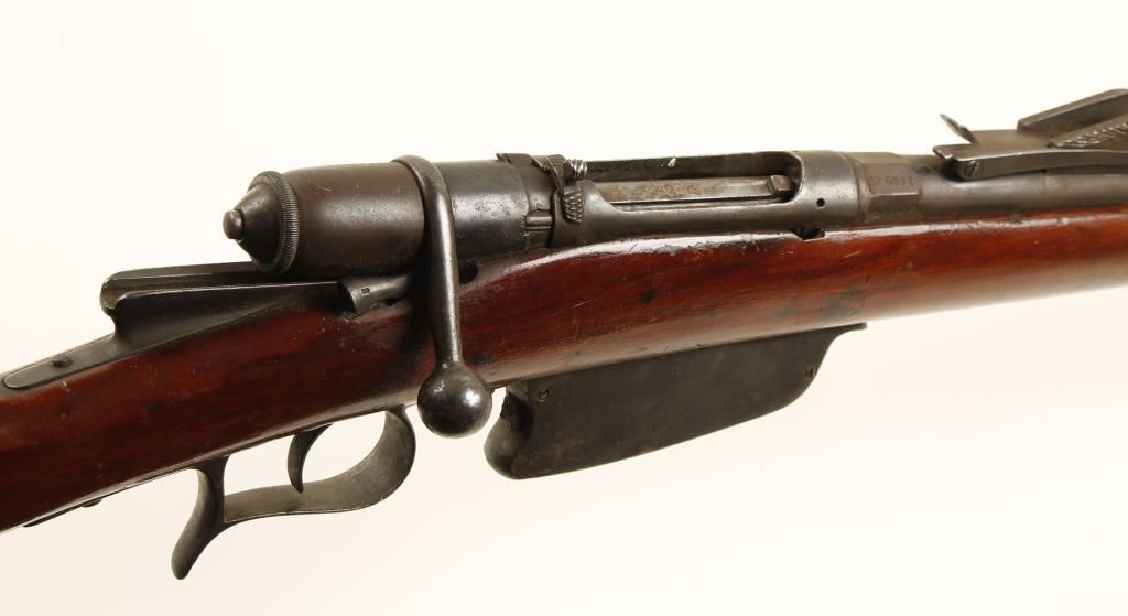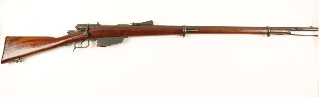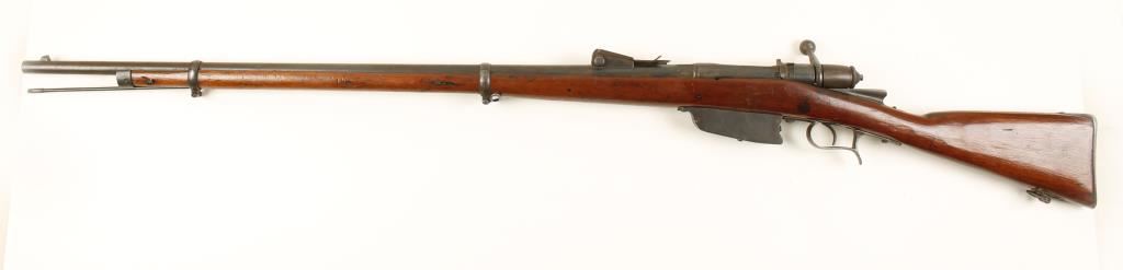 Italian (Terni) made bolt-action military rifle with a 33" barrel dated 1885. Metal finish is a surface pitted brown patina. Stock has been re-varnished and shows no visible cracks but it does have a pinned repair to the buttstock below the nose of the comb. It has its share of attendant dings, scrapes and rubs. Bore is shiny with good rifling. Action works. Condition is fair to good. *Antique Firearm*