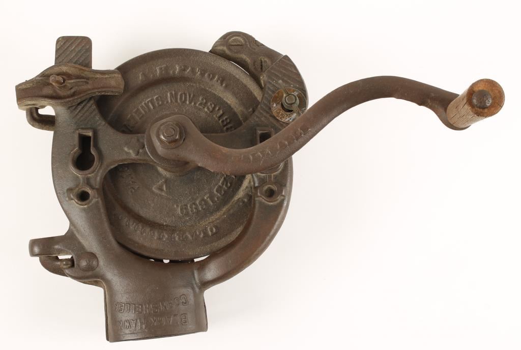 Black Hawk Corn Sheller. Made by A.H. Patch, Clarkville, Tenn. Patent dates Nov. 3, 1886 & July 23, 1889. Parts move freely. Stands about 12" tall not including handle. Collection bin not included.