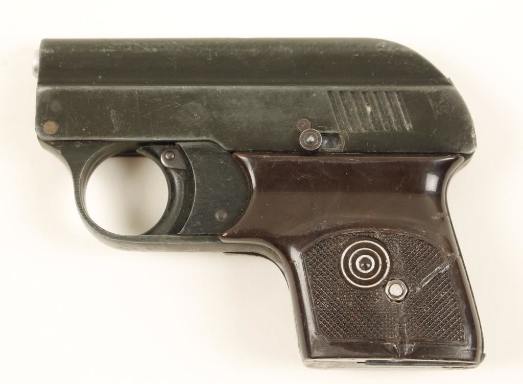 Blued semi-automatic blank-firing starting pistol with one magazine. Bluing is worn and faded with scratches. Plastic grips have a repaired break. Action works. Condition is fair.