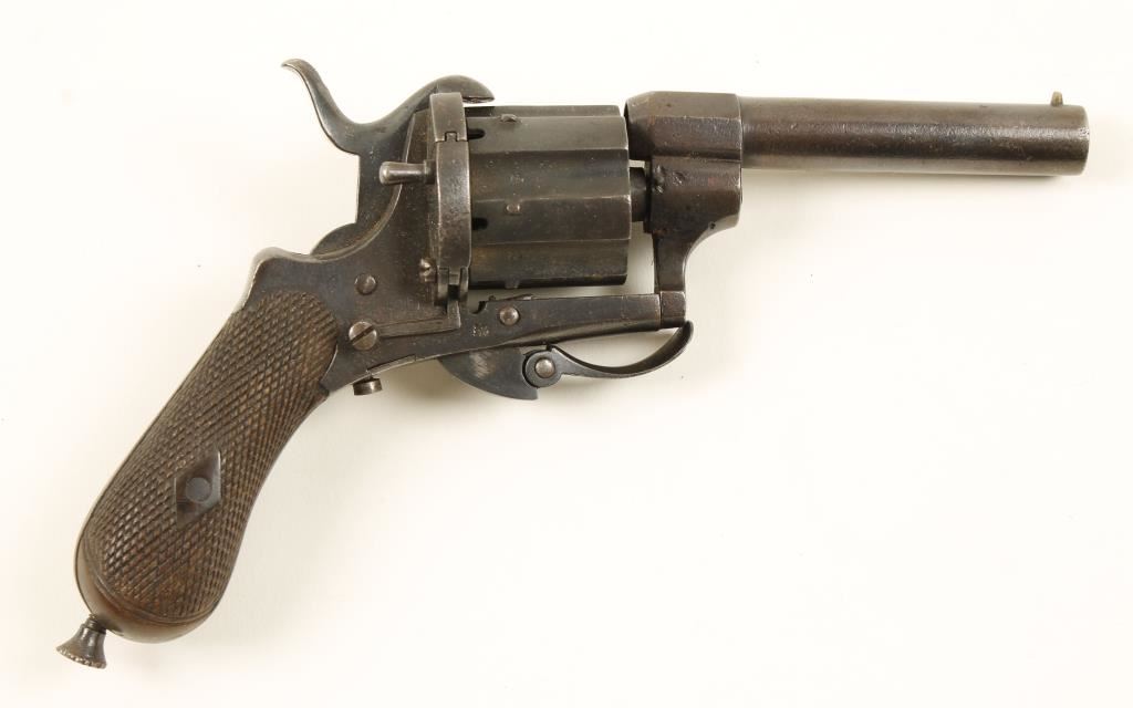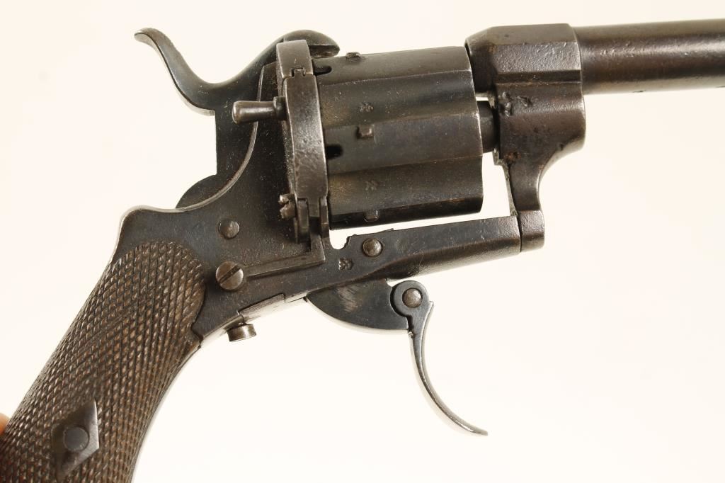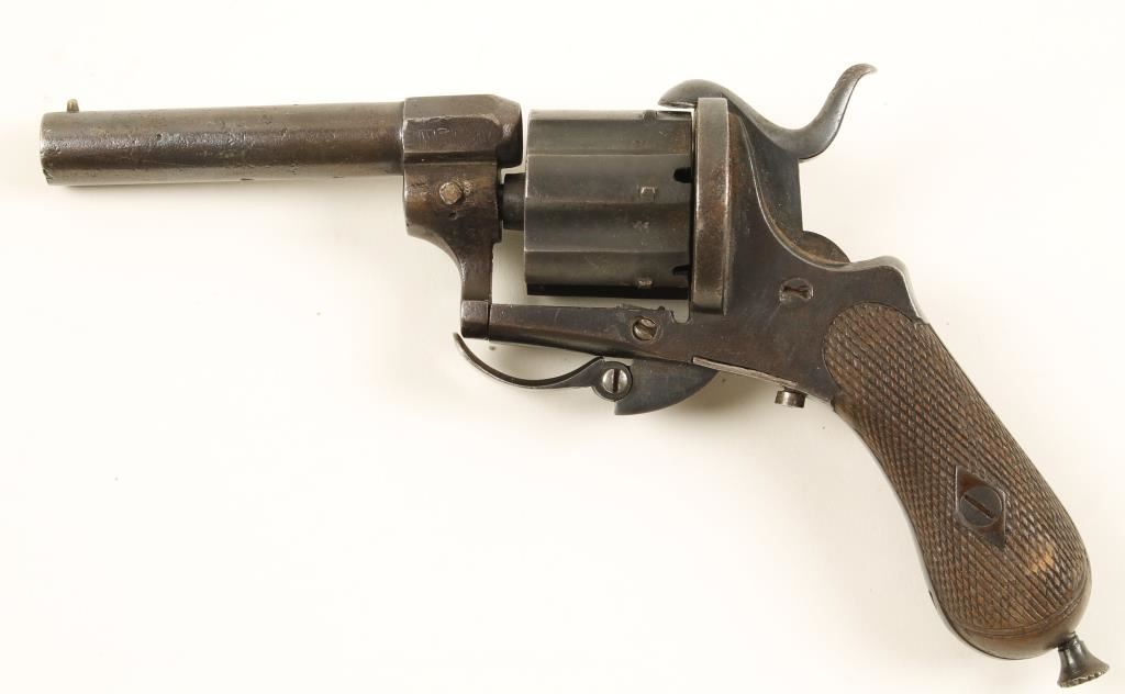 SN: 4377 Reblued single-action spur-triggered 5-shot tip-up revolver with a 3-1/4" barrel and top rib. Finish is a nitre blue with some pin-prick pitting, tiny scratches and surface rust stains. Bore is dark and rough with visible rifling. Chambers are dark and rough. Action works well. Hard rubber grips have wear but no cracks or chips. Condition is good. *Antique Firearm*"