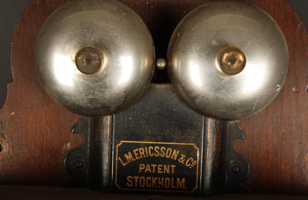 1907. Great display piece with exposed bells, old fashioned handset and wooden case. Front reads "L.M. Ericsson & Co., Stockholm, Trade Mark" around picture of old tabletop handset phone.