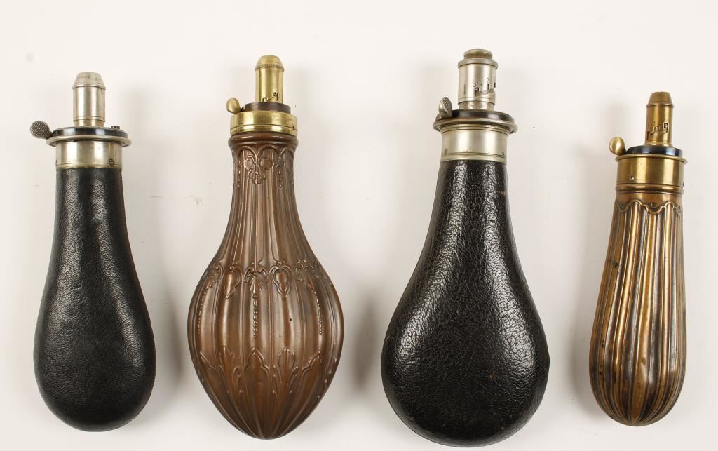 Including 2 metal shotgun type flasks and 2 Hawksley flasks, which is leather covered and marked "GN J.W. Hawksley" on lid-fine condition for its age.