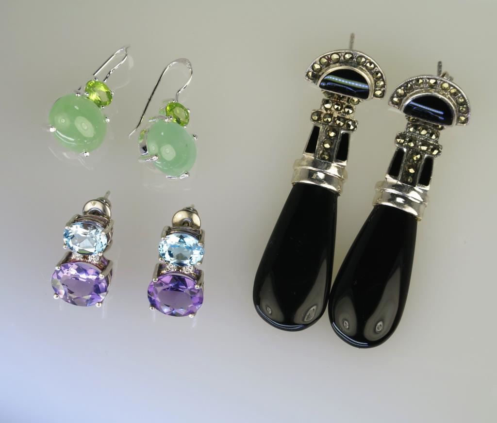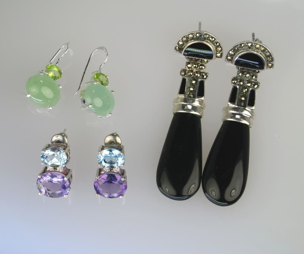 1 Amethyst and Blue Topaz, 1 Jadite and Peridot, 1 Art Deco Style Onyx and Marcasite Earrings.