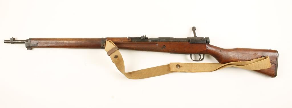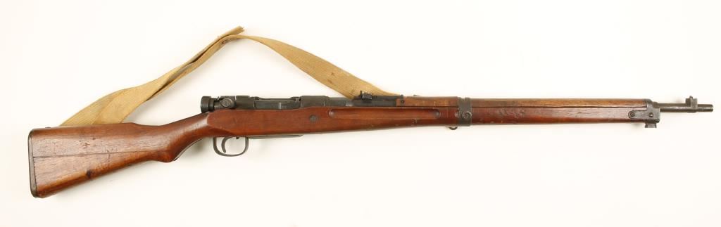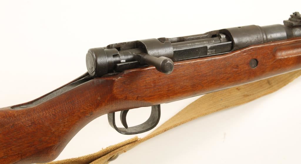 Blued Japanese military bolt-action rifle with a 25-1/2" barrel and a web sling. Metal has surface rust and dings. Wood has dings, rub,s scrapes and scratches. Bore is shiny with light rifling. Action is fine. Condition is fair to good. *Modern Firearm*