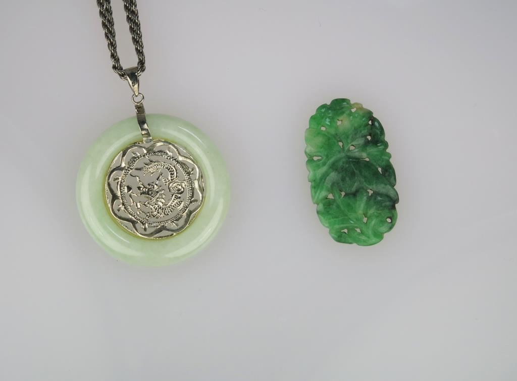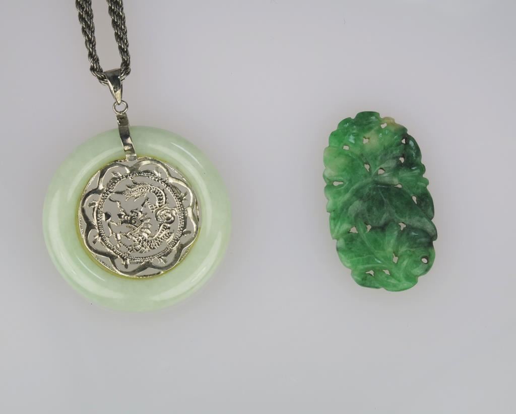 Jade Medallion Pendant with Sterling Silver Dragon design and Hand Carved Floral Motif Jade Piece.
