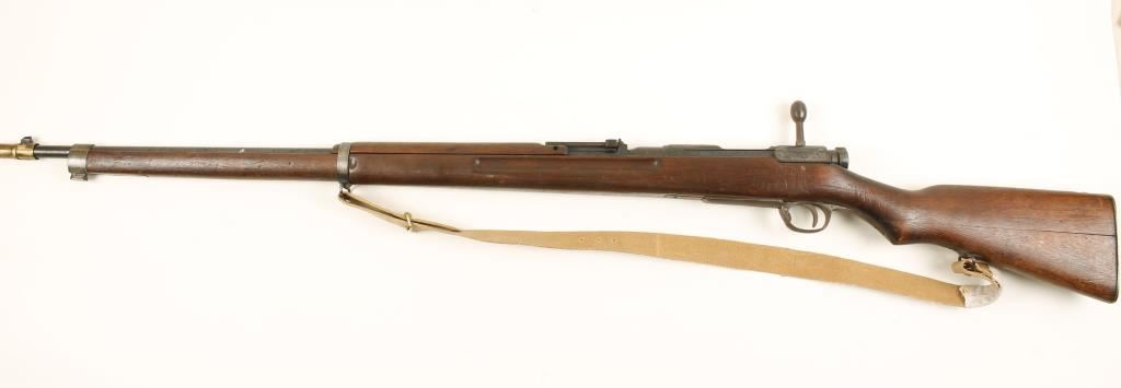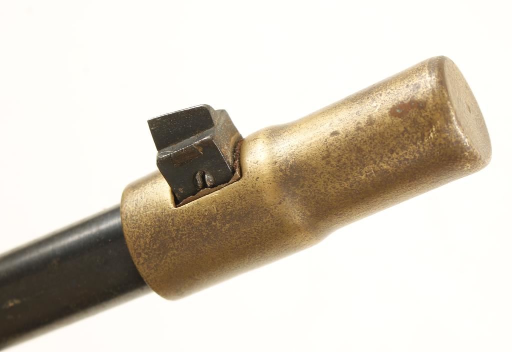 Japanese military blued bolt-action rifle with a 31.1" barrel, a 2-piece brass muzzle cover and a cloth sling. The "Mum" is intact. Bluing has some surface rust and light pitting. Bottom metal and floor plate have lots of surface rust. Wood is split along the joint in the butt and there are many small scratches and dents. Bore is dark with strong rifling. Action is good. Condition is good