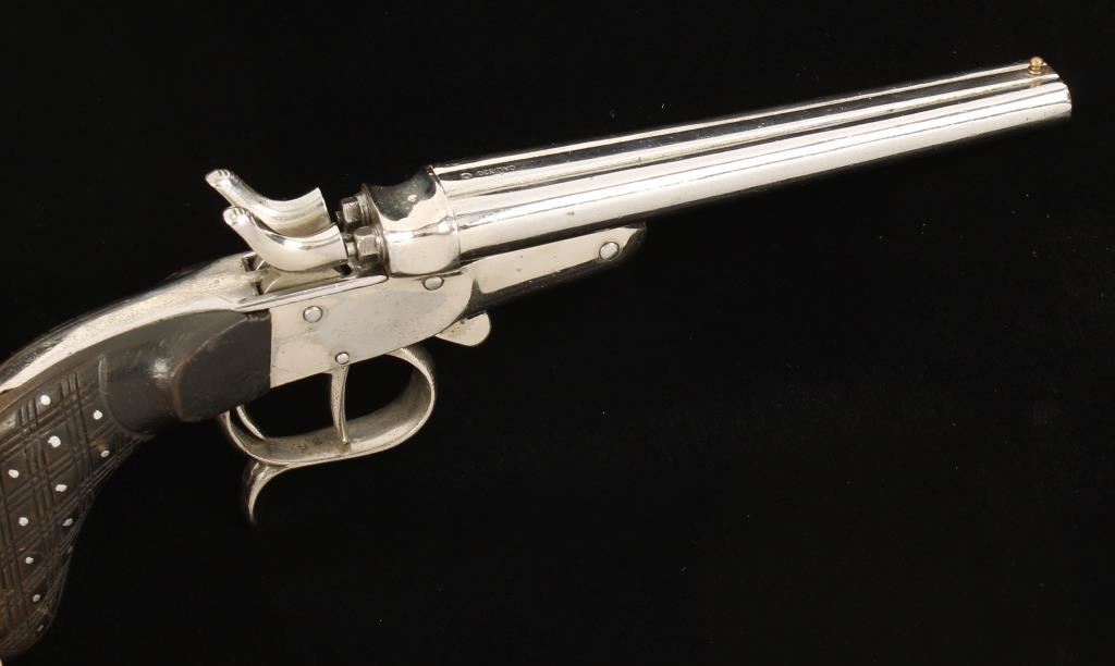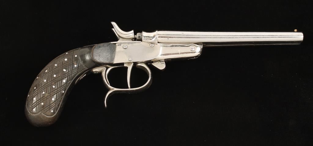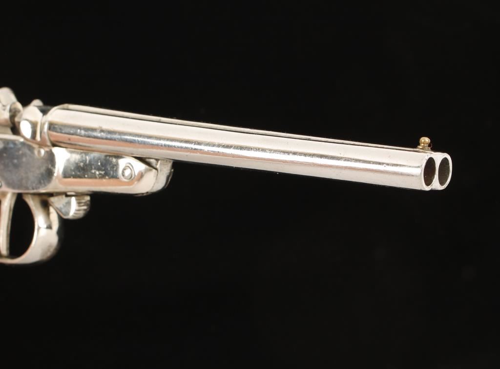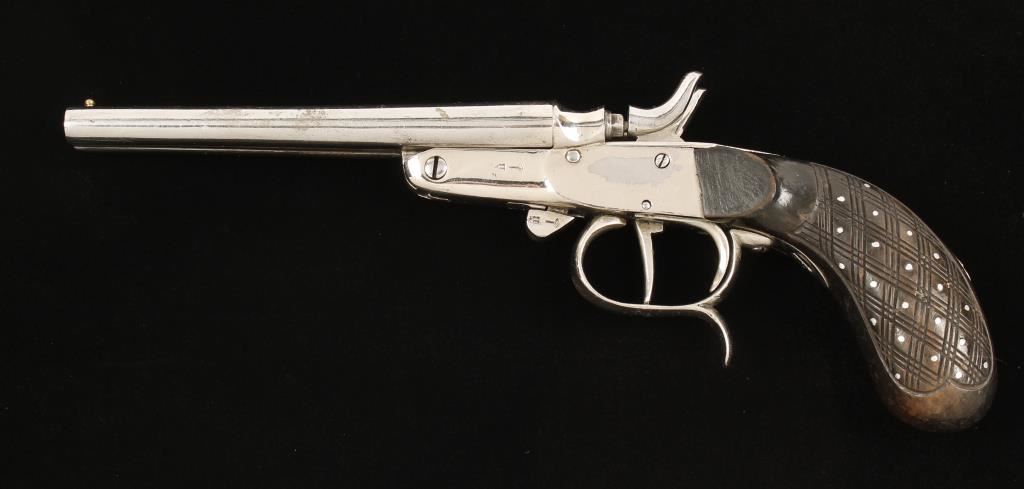 Nickel plated double barreled "rabbit-eared" pistol firing a .32 caliber rimmed cartridge. This bears the crown over R and Tower proofs from Belgium. The plating has some dings, scratches and wear points but is in 90% or better condition. The right hammer and front trigger work but the left hammer and rear trigger do not. This is a smoothbore and the right tube has two impediments near the muzzle. The round knob wood grip is checkered with silver colored studs in the skip checkered gaps. Condition is good. *Modern Firearm*