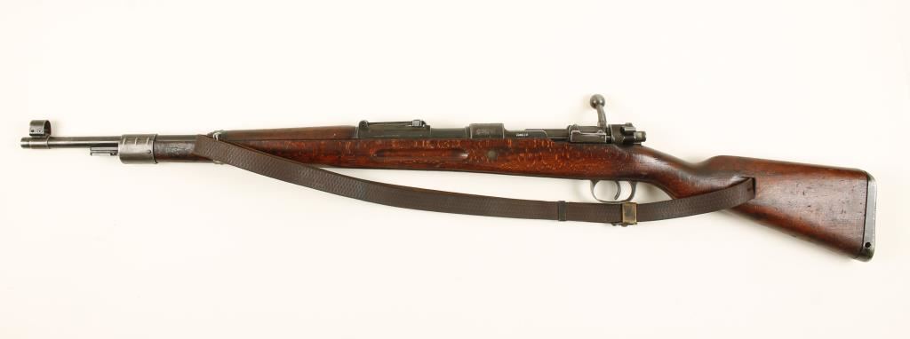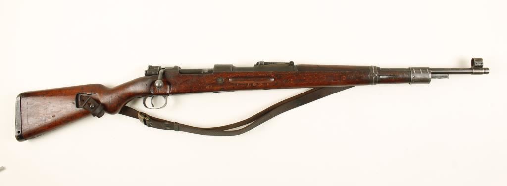 German military blued bolt-action rifle with a 24" barrel and a leather sling. Import marked. Made in 1942. Finish has suffered from general wear and pitting. Barrel bands are welded stampings. Re-chambered to 7.62 as stamped on the receiver. Wood is stamped 7.62, has a small circular mark on the stock, and is moderately well dinged up. Bore is shiny with rifling. Action is working well. Condition is fair. *Modern Firearm*