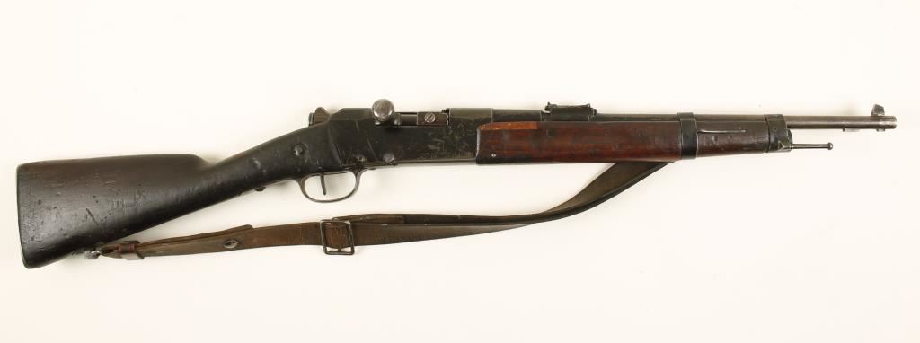 French military blued bolt-action carbine with an 18" barrel and leather sling. Bluing has worn or faded away to a bare metal with pitting and stains. All serial numbers match. Wood has serial number stamped on it. Stock is battered with a repair at the upper tang and two at the rear of the forend, one at each barrel band and a crack at the forend tip. Bore is frosty with rifling. Action is good. Condition is poor. *Modern Firearm*