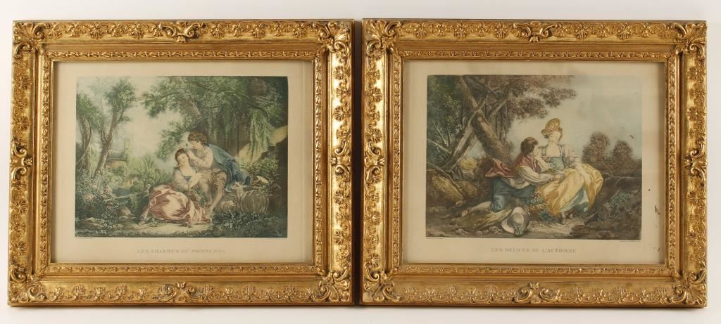 1 is titled "Les Charmes de Printemps" and the other is titled "Les Delices de L'Automne". Both in elaborate gold molded frames. Image sizes 13 1/4" x 10 1/2"