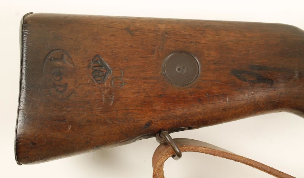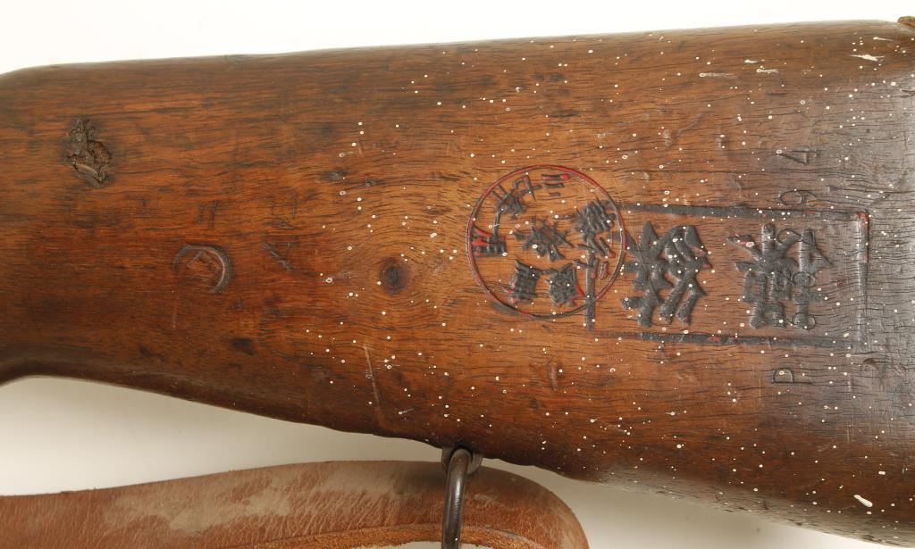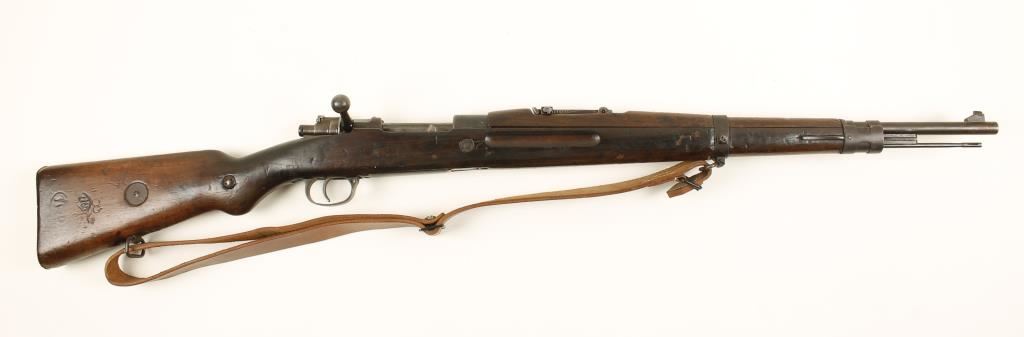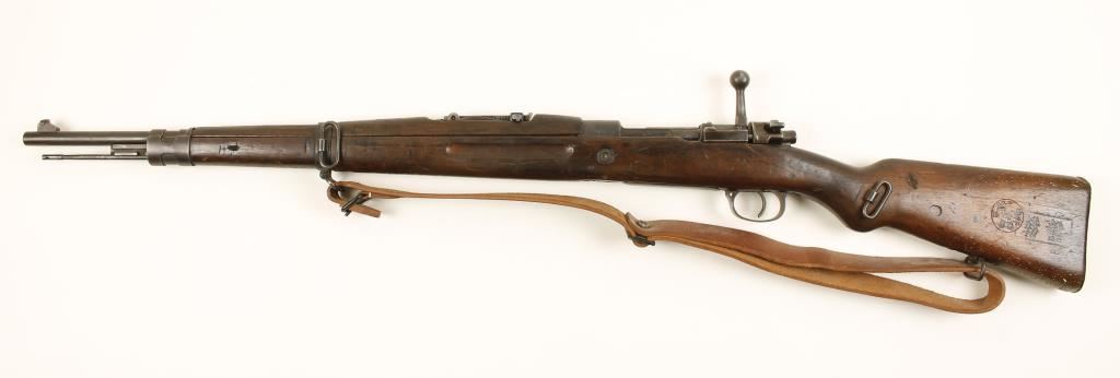 Czechoslovakian made military blued bolt-action rifle with a 23-1/2" barrel and a leather sling. Dated 1937. Bluing has faded to a brown patina with pin-prick pitting. Wood has matching serial number over-stamped by oriental characters in cartouches and 2 other stamps in diamonds that I can't read. There are numerous deep dings and other dents and scratches. Bore is dark with strong rifling. Action is good. Condition is poor. *Modern Firearm*