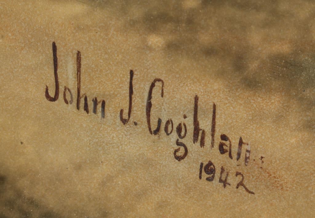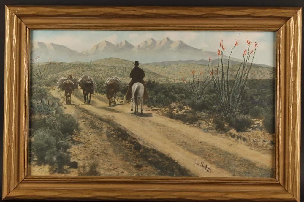 Depicts Cowboy on horseback with pack mules going down a Southwest trail. Hand signed and dated 1942.